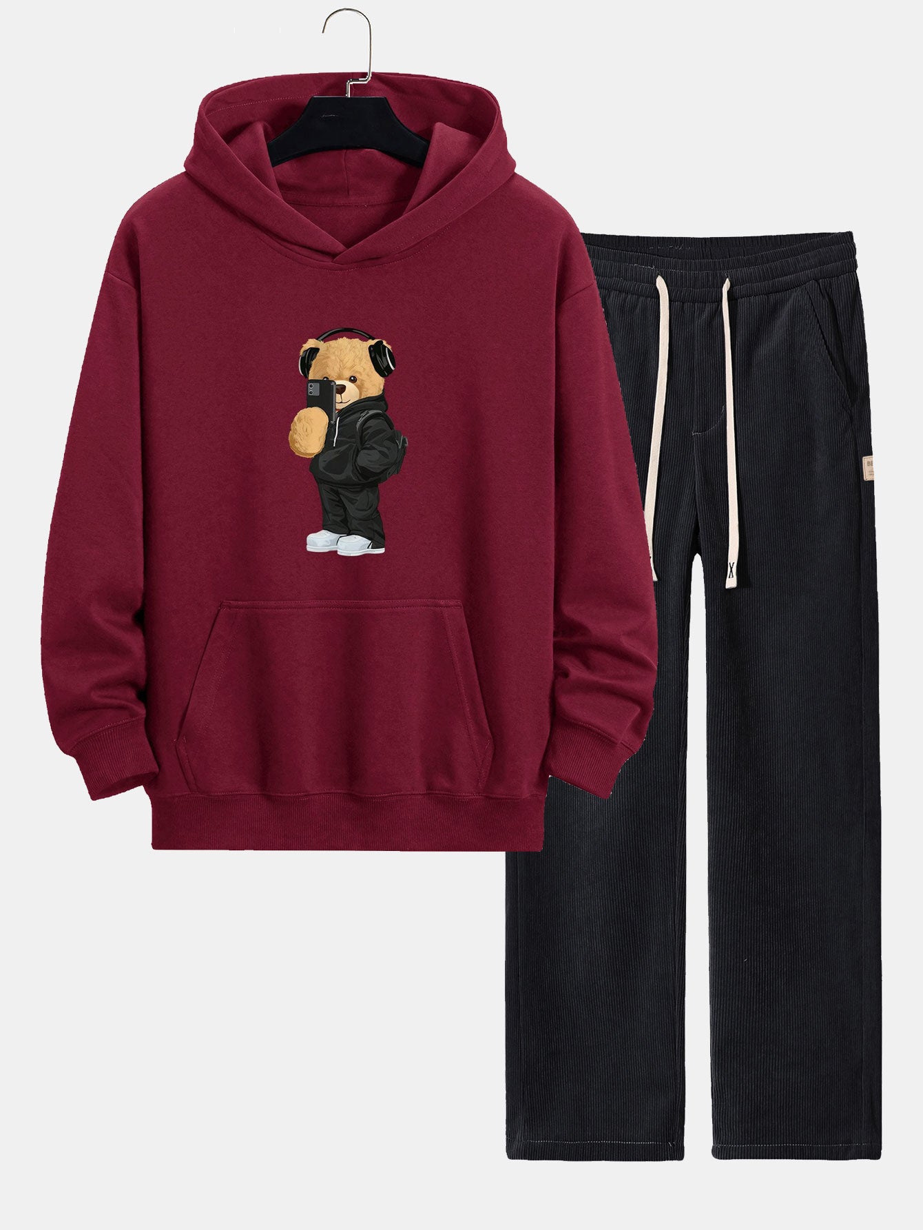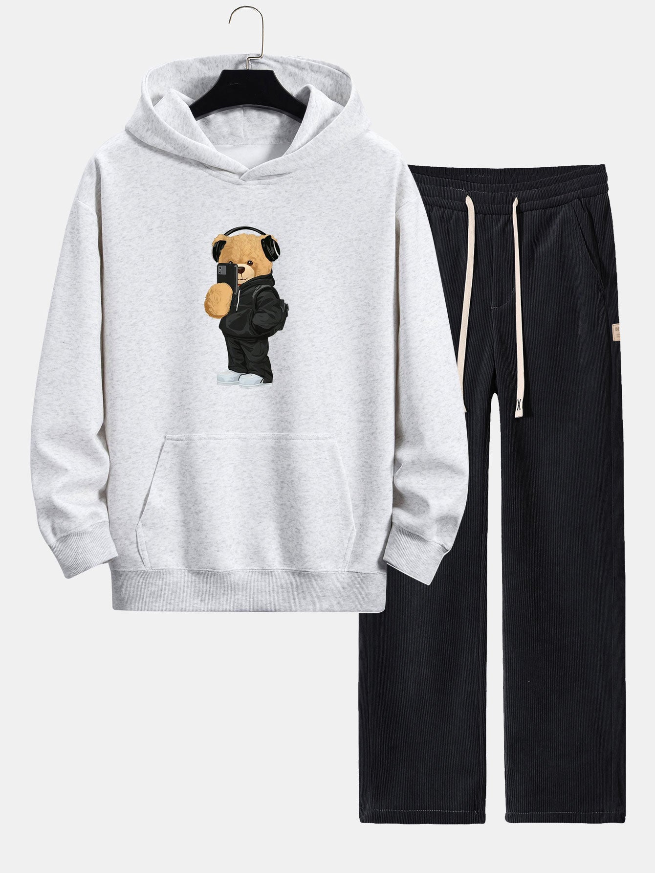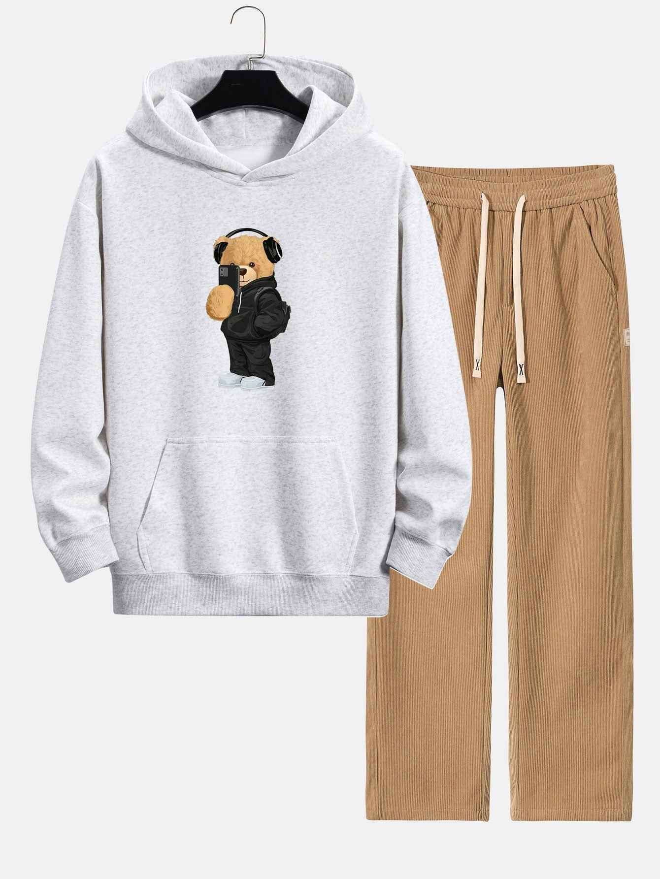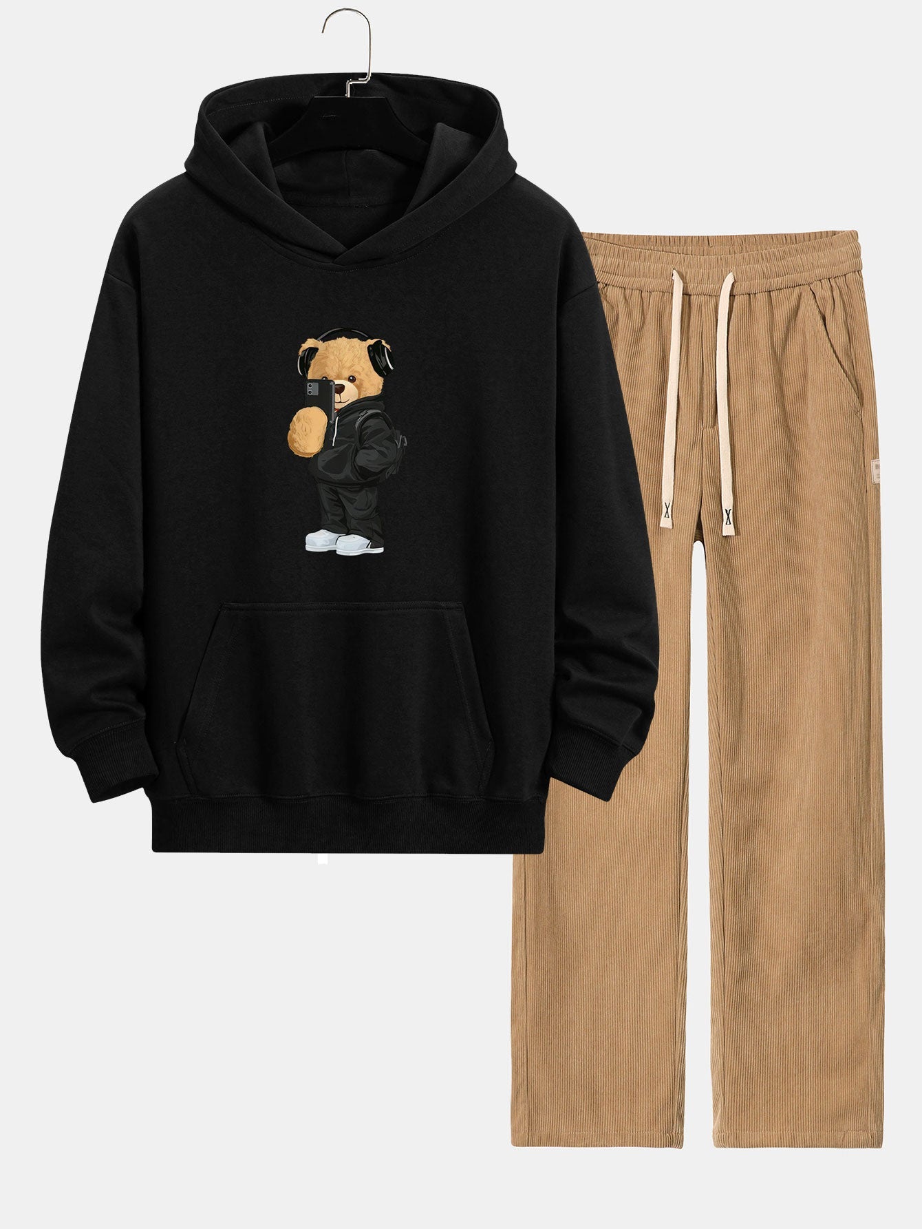Fashion Bear Taking Photo Print Relax Fit Hoodie & Straight Leg Corduroy Pants