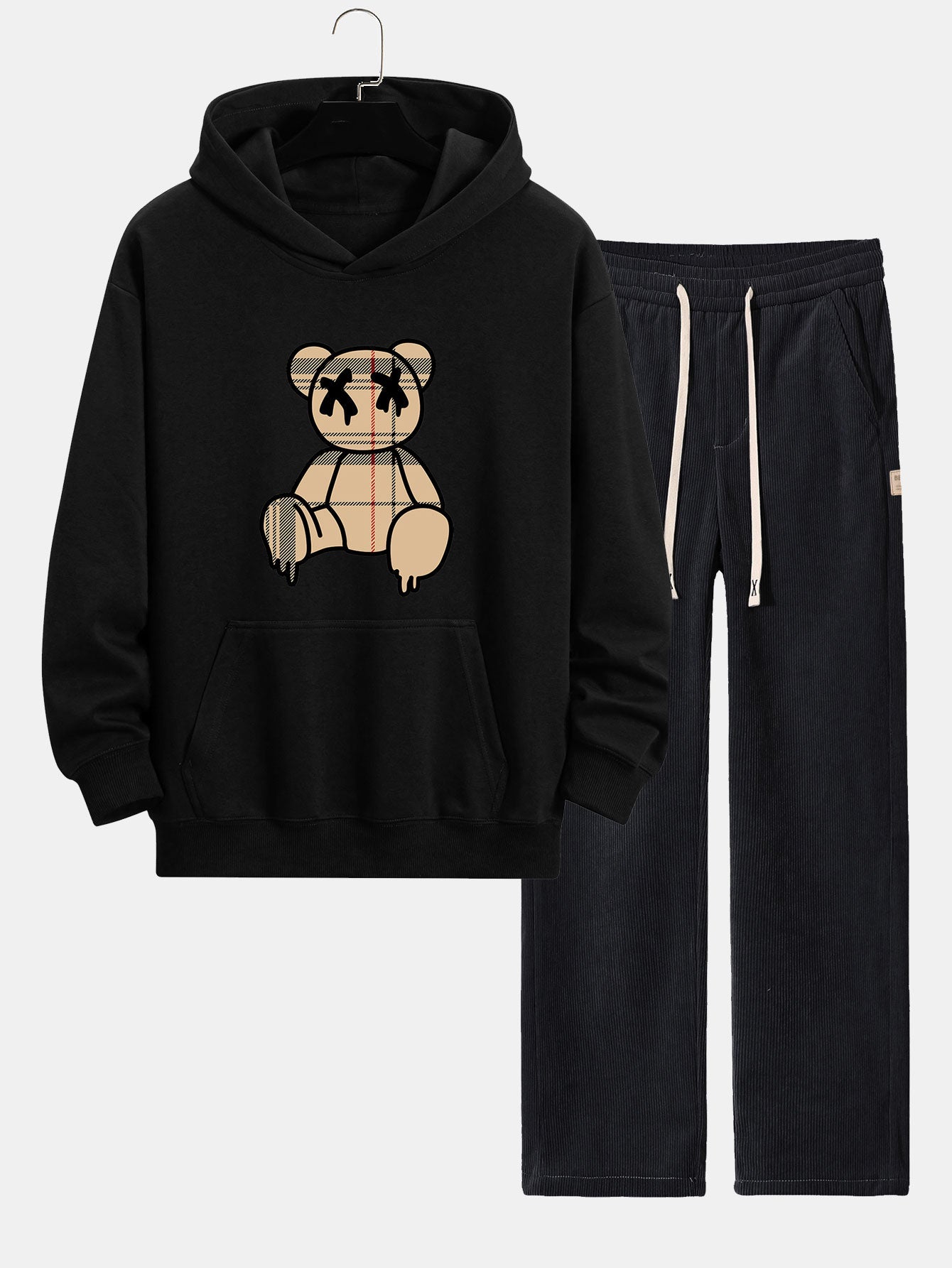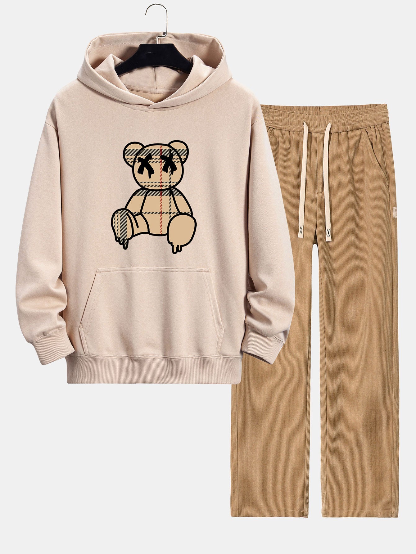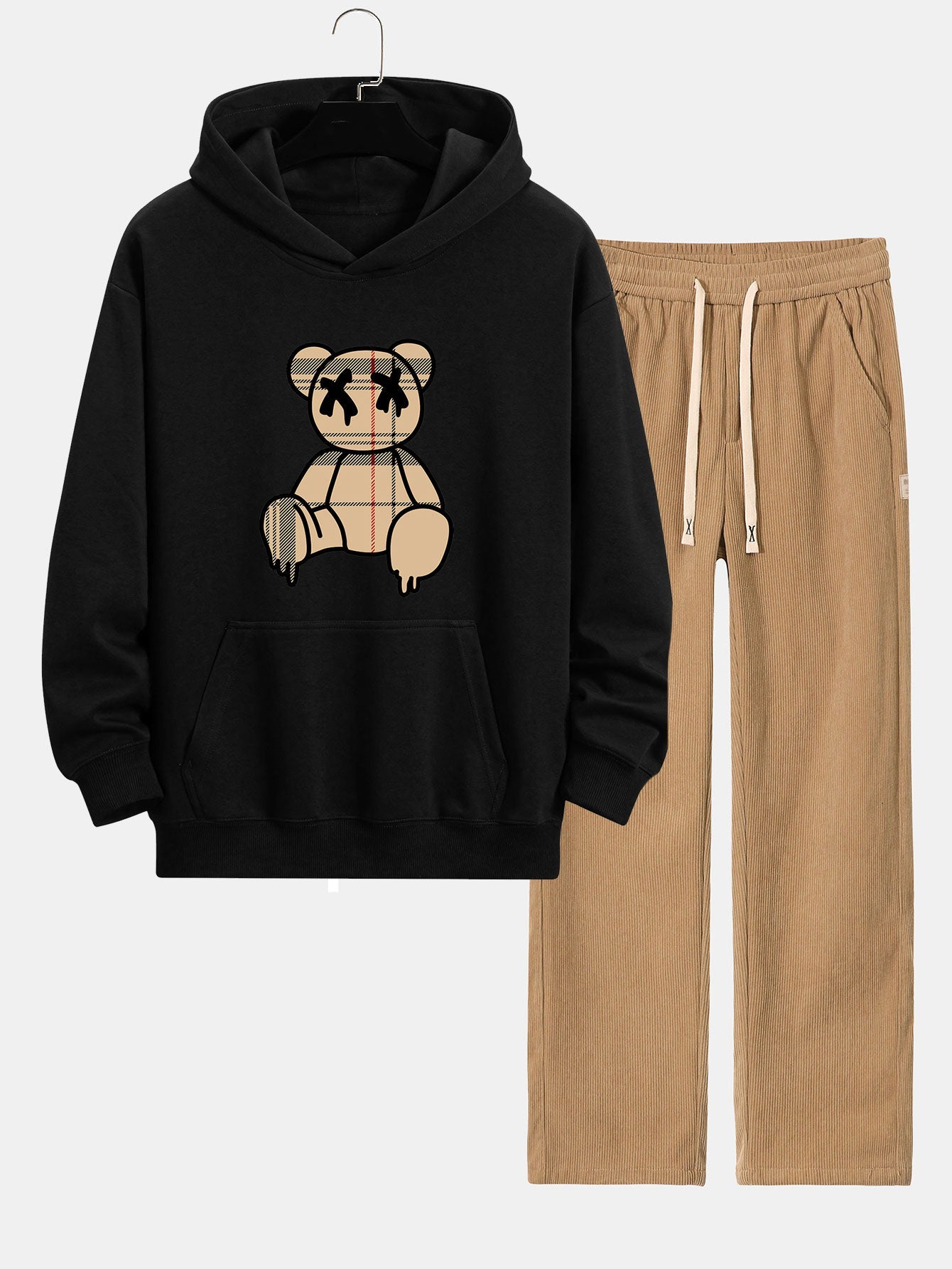 Plaid Dissolving Bear Print Relax Fit Hoodie & Straight Leg Corduroy Pants