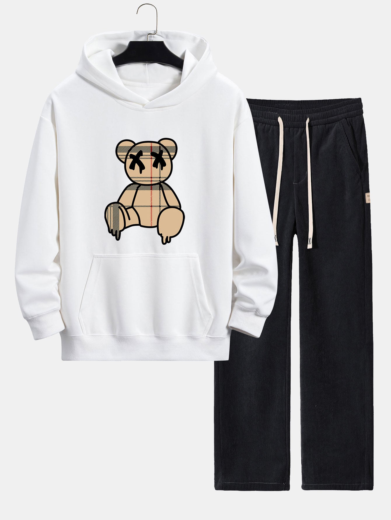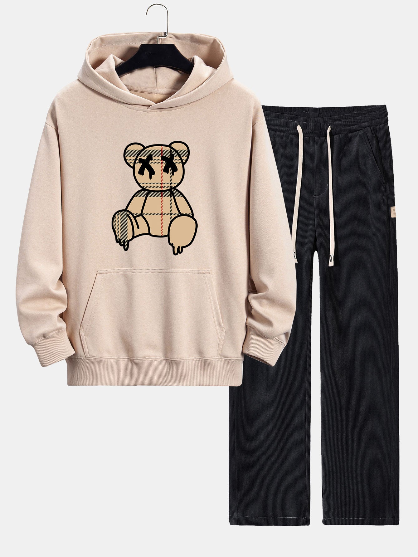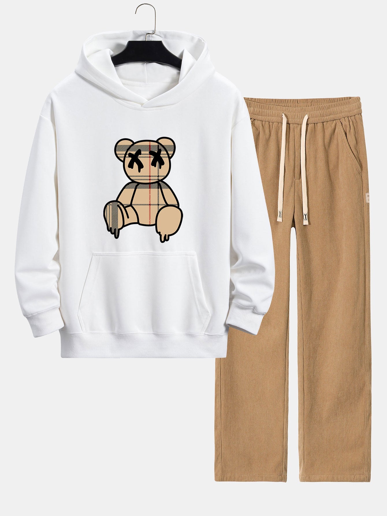 Plaid Dissolving Bear Print Relax Fit Hoodie & Straight Leg Corduroy Pants