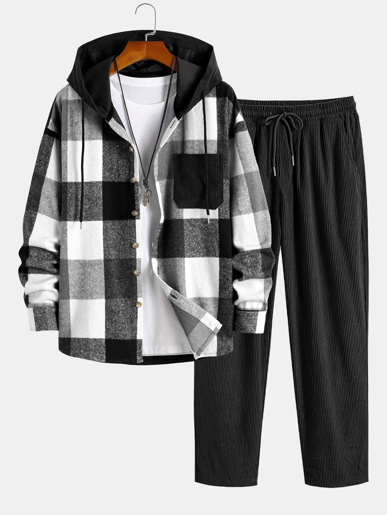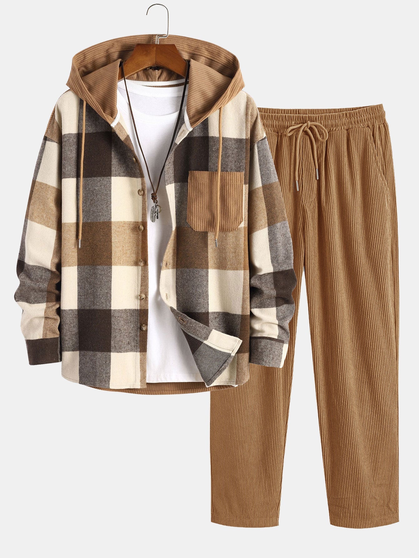 Relax Fit Flannel Plaid Corduroy Patchwork Hooded Shirt & Straight Leg Corduroy Pants